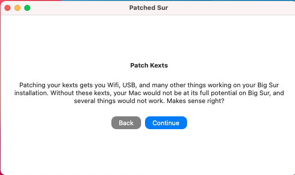 5. 登录 Big Sur,发现问题 Wi-Fi无法使用,感觉是驱动没有安装,找文档,发现Big Sur 的安全模式更高,无法用优盘打开Big Sur硬盘,后来发现 Pathced Sur 有一个安装完成后的步骤,我没有运行,我运行后,发现有一个选项,就是Patch Kexts,可以安装Wi-Fi和USB Patch,于是运行,重启,发现Wi-Fi可以正常使用,目前一切正常
